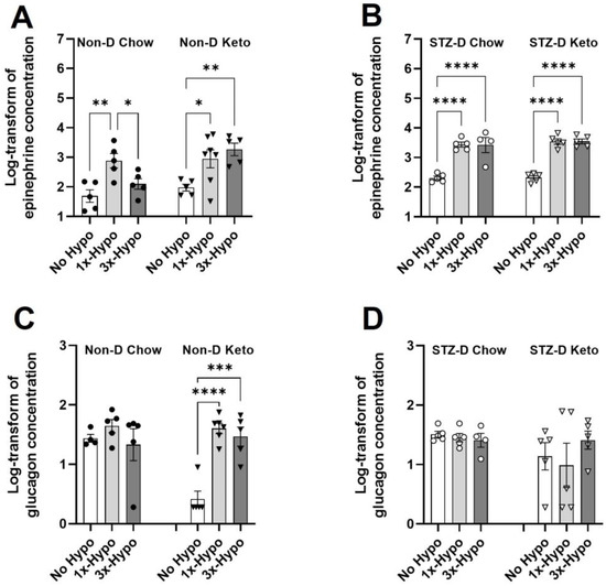 Ketogenic diet differentially affects hypoglycemia counterregulatory hormones in non-diabetic and diabetic rats. (A) Recurrent hypoglycemia (3×-Hypo) reduces epinephrine counterregulatory response in non-diabetic chow-fed rats; no reduction is observed in non-diabetic keto-fed rats; (B) Epinephrine counterregulatory response to recurrent hypoglycemia (3×-Hypo) is preserved in STZ-diabetic chow- and keto-fed rats; (C) Single (1×-Hypo) or recurrent (3×-Hypo) hypoglycemia did not induce glucagon counterregulatory response in non-diabetic chow-fed animals, but significantly increase its release in non-diabetic keto-fed rats; (D) No changes in glucagon concentration were detected in STZ-diabetic animals. Log-transformed concentrations of epinephrine and glucagon (pg/mL) were analysed by one-way ANOVA with Holm-Šídák multiple comparisons test. Data are mean ± SEM, * p < 0.05, ** p < 0.01, *** p < 0.001, **** p < 0.0001.