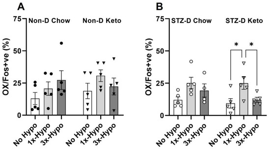 Recurrent hypoglycemia attenuates OX neurons activation in STZ-diabetic keto-fed rats. (A) The proportion of Fos-positive OX neurons did not change with hypoglycemic challenge in any of the non-diabetic groups of rats; (B) Single (1×-Hypo) hypoglycemia increased the proportion of activated OX neurons in STZ-diabetic keto-fed rats compared to the No Hypo control and recurrent hypoglycemia (3× Hypo) attenuated this increase; no differences in OX activity were detected in STZ-diabetic chow-fed rats. Data analysed by one way ANOVA with Holm–Šídák multiple comparisons test. Data are mean ± SEM, * p < 0.05.