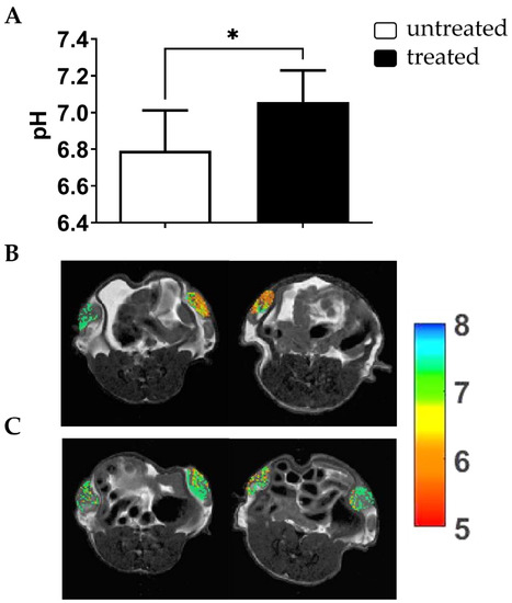 A Bruker Avance Neo MRI microimaging scanner operating at 7 Tesla (Bruker Biospin, Ettlingen, Germany) and equipped with a quadrature 1H coil was used to acquire all the images. Mice were anesthetized for the MRI acquisitions, and before their placement in the scanner a tail vein catheter was placed to inject Iopamidol. The imaging protocol involves the acquisition of scout images and of a T2-weighted multislice sequence, followed by the Z-spectra (CEST) acquisition. CEST acquisition parameters were: B1 = 3 µT, TS1 = 3 s, TS2 = 1 s, offsets = 46, offset range: −10 to +10 ppm, matrix = 128 × 128, FOV = 30 × 30 mm, number of slices = 8, slice thickness = 1.5 mm, TR = 11.2 s, and TE = 3.9 ms [51]. Iopamidol was injected after the first CEST acquisition (dose: 4 g Iodine/kg b.w.) and a second CEST image was acquired to calculate the tumor extracellular pH maps. MRI-CEST pH images were acquired in the first cohort of mice (acute effect) 3 hours after the Esomeprazole administration, whereas in the second cohort of mice (chronically treated) they were acquired after the first and the second week of treatment.