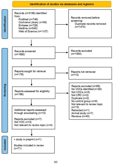 Two authors (RV and HC) independently reviewed titles and abstracts of all retrieved articles. Human studies were included if they specified VOC identification in any biological matrix in relation to sporadic colorectal neoplasia compared to controls (i.e., subjects without colorectal neoplasia). Sensor-based applications were excluded as they do not allow for VOC identification. The PRISMA flowchart is shown in Figure 1a. The search yielded a total of 3156 records, of which 1474 were duplicates. Then, 1682 abstracts were independently screened by HC and RV. Reviews were scrutinized for missed publications. In case no consensus was reached, the article was retained for the next selection phase. Only full text articles of original studies in English were included, leading to the exclusion of reviews, abstracts, letters, editorial, and non-English publications (n = 1504). Full texts of twelve articles could not be retrieved and were excluded. The full texts of 166 studies were assessed for eligibility. Then, 99 studies were excluded for not meeting the inclusion criteria. Snowball referencing of articles in reviews yielded an additional ten potential studies of which seven were excluded. One study conducted by the authors was accepted for publication at the time of writing and was included for analysis. A total of 71 studies were included for analysis.