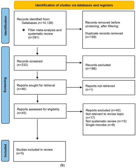 A second systematic search on CRC-associated gut microbiota is shown in Figure 1b. The search yielded a total of 14,126 records. After filtering for systematic reviews, meta-analyses (n = 391), and duplicates removed (n = 159), a total of 232 records were independently screened. Systematic reviews that provided data on gut microbiota composition in colorectal neoplasia compared to controls in any biological matrix were included in the review. Reviews targeting specific microbes and animal studies were excluded. Only full text articles of systematic reviews and meta-analyses in English were included, leading to the exclusion of abstracts, letters, editorials, original studies, and non-English publications (n = 189). The full text of one article could not be retrieved and was excluded. The full texts of 45 studies were assessed for eligibility. Five systematic reviews were included for data extraction.