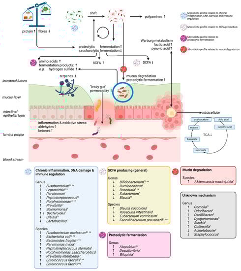 A schematic overview of the volatolome and gut microbial microenvironment in colorectal neoplasia. Diets low in fiber and rich in proteins cause a decrease in saccharolytic fermentation and an increase in proteolytic fermentation. As a result, detrimental amino acids and proteolytic fermentation products (including branched chain fatty acids) increase in concentration while beneficial short chain fatty acids decrease in concentration. This temporary effect can become long-term by adhering to such a diet for longer periods, presumably by causing shifts in gut microbiota. Unfavorable microbes can degrade host glycans and mucins in the intestinal lumen, which have a function in maintaining gut barrier integrity. This cycle is self-empowering. Moreover, such unfavorable gut microbiota shifts may include an unfavorable mycobiome, causing a rise in terpenes. As a consequence, in addition to other immune-related factors, the intestinal barrier function is compromised, causing low-grade systematic oxidative stress and giving rise to enhanced aldehyde and ketone concentrations. In turn, microbes may produce amines for protection. In addition, the microbiota may also be involved in pathways that enhance Warburg metabolism and thus empower cancerous cells by providing energy for fast growth, as the aerobic tricarboxylic acid cycle is downregulated in cancerous cells. In this figure, only the volatolome was considered in relation to the microbiota. CRC-associated microbiota data is adapted from references [100,101,102,103]. Up arrows denote CRC or adenoma-enriched VOCs and gut microbiota; down arrows denote CRC or adenoma-depleted VOCs and gut microbiota. BCFA: branched chain fatty acid, SCFA: short chain fatty acid, TCA: tricarboxylic acid cycle, VOCs: volatile organic compounds, f = fecal sample, t = tissue sample, s = saliva sample, +a = also observed in colorectal adenomas.