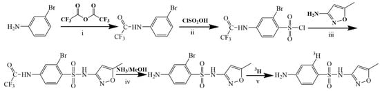 Using meta-bromoaniline as raw material, the amino group was protected by trifluoroacetic anhydride and then reacted with chlorosulfonic acid to obtain 2-bromo-4-trifluoroacetylbenzenesulfonyl chloride. Then, it was condensed with 3-amino-5-methylisoxazole, and after alkaline hydrolysis and deprotection, 2-bromo-sulfamethoxazole was prepared, and it was reacted with tritium gas under the action of palladium-carbon catalyst and alkali acceptor to generate tritium-halogen exchange to produce 2-[3H]-sulfamethoxazole.