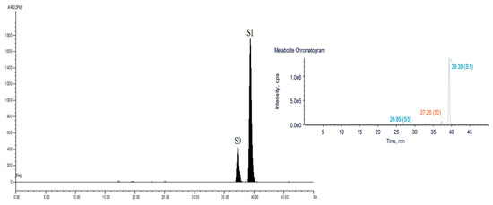 In pigs, SMZ metabolism was the same as in rats. S0 and S1 were detected in the urine after administration by LC-ν.ARC (Liquid Chromatography tandem On-line isotope detector) in Figure 3. There were trace amounts of S5 first detected in pig urine at 0–0.5 d by LC/MS-IT-TOF as shown in Figure 3. The present drug (S0) and S1 accounted for 24.6% and 75.4% of the total radioactivity in the urine from 0–0.5 d, respectively (Table 3). In the feces, only S0 and S1 were detected at 12 h post-dosing, with ratios of 12.1% and 87.9%, respectively (Table 3). S0 was not detected after 7 d of administration, only S1 was detected. After 12 h of administration, only S0 and S1 were detected in the feces samples, accounting for 12.1% and 87.9%, respectively (Table 3), S0 was not detected 7 d after administration. S0 and S1 were found in the blood and bile after 12 h of the final dosing, but only S0 and S1, not S5, were observed in the liver, kidney, muscle and fat (Table 4).