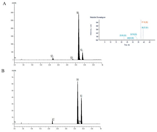 Radiochromatogram and total EIC of SMZ and its metabolites in the feces of chickens at 0–0.5 d (A) and 0.5–1 d after administration of [3H]-SMZ (B). S0, sulfamethoxazole; S1, N4-acetyl-sulfamethoxazole; S2, 5-hydroxysulfamethoxazole; S3, N4-hydroxysulfameth-oxazole; S4, N4-sulfatesulfamethoxazole; S5, N4-glucuronidsulfamethoxazole.