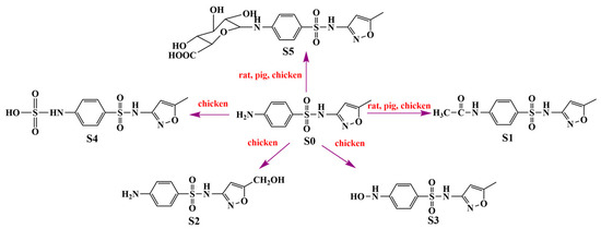 Overall, SMZ has the largest number of metabolites observed in chickens, and its metabolism is more extensive than in rats and pigs. S0, S1 and S5 were found in rats, chickens and pigs, and S1 was the major metabolite in three species. S2, S3 and S4 were only observed in chickens. These interspecies differences can be explained by a difference in the amount and type of iso-enzymes in the cytochrome P450 system in the liver [23]. According to the structure, persistence and percentage of metabolites, the possible metabolic schemes of SMZ in pigs, chickens and rats were shown in Figure 5.