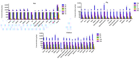 X axis: the main tissues of [3H]-SMZ distribution, Y axis: the radioactivity concentration of [3H]-SMZ (μg/kg), among which, rats lists the [3H]-SMZ tissue distribution results at seven time points, pigs and chickens list [3H]-SMZ tissue distribution results at five time points.