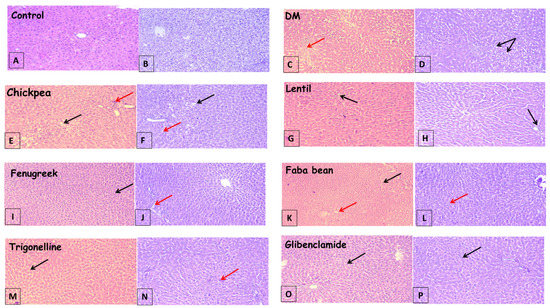 The effect of the various treatments on serum AST, ALT, and ALP in diabetic rats is summarized in Table 1. Results showed a significant increase in ALT level in the diabetic group by 52.70%, as compared with the control group. Treatment of diabetic rats with sprouts derived from chickpea, lentil, fenugreek, and faba bean, alongside trigonelline and glibenclamide standards, exhibited a significant decrease (p < 0.05) in ALT level by 15.9, 23.0, 14.6, 23.9, 20.8, and 28.3%, respectively, compared with the diabetic group. Based on that, the ALT level was improved by 24.3, 35.1, 22.3, 36.5, 31.8, and 43.2%, respectively, following these treatments. Faba bean and lentil were the most active sprouts, whereas trigonelline showed a decrease similar to that produced by chickpea and fenugreek sprouts.