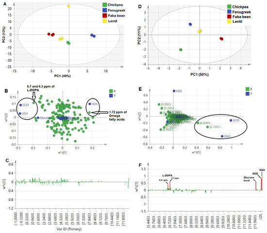 Firstly, binned NMR spectra from all sprouts (δH 0.0–11.0 ppm) of 0.04 ppm width were modeled against the different antidiabetic activity and associated complication parameters. The score plot (Figure 3A) demonstrated the wide distance of the fenugreek sprout from all other sprouts, which could be correlated with HDL levels to the right of the loading plot (Figure 3B). In addition, faba bean sprout was found on the most left side of the score plot, correlated with GSH and SOD being rich in aromatic signals at the 6.7 and 6.3 ppm assigned for L-DOPA [8]. The corresponding loading bar plot (Figure 3C) failed to reveal a clear correlation between activity and NMR signals, likely due to the abundance of primary metabolites, i.e., sugars and organic acids, as is typical in most plant extracts, contributing less to the sprouts’ efficacy. Additionally, prediction power (Q2) was weak at 0.21, although of good variance coverage (R2 of Y-intercept = 0.83), based on the 4 calculated PCs. This model’s weakness is likely due to interference from sugar signals not related to the health effect and abundance in the sprout samples. Consequently, another model was constructed from the aromatic region (δH 5.5–11.0 ppm) more specific toward secondary metabolites and likely to account for the antidiabetic effect. Our previous NMR metabolomics revealed that aromatic regions provided a stronger PCA model [17], and it is first time to be examined here in the case of PLS.
