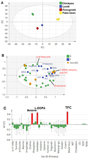 The constructed model combining absolute quantification of metabolites and measured biological parameters showed much higher prediction power at 0.8, compared to 0.2 and 0.4 in the whole and aromatic NMR regions, respectively, that were based on an untargeted PLS approach. Such a model is expected to better pinpoint potential candidates for the prediction of metabolites mediating legume sprouts’ antidiabetic actions. The score plot (Figure 4A) revealed that faba bean was the most discriminant sample, found on the right side with positive score values from other sprout samples. The biplot (Figure 4B) revealed a strong correlation of L-DOPA, betaine, and total flavonoid content (TFC) with blood glucose, GSH, and SOD, confirming the previous results found in regression analysis (Section 3.4.1) and a further untargeted approach for L-DOPA. Additionally, the bar loading plot (Figure 4C) confirmed the prominent effect of TFC, followed by L-DOPA and betaine. Flavonoids have been well documented for their antidiabetic effect in foods and, more specifically, in legume sprouts, including extract of Lens culinaris and associated serum-lipid profiles [14], and Cicer arietinum extracts via their antioxidant and intestinal α-glucosidase inhibitory effects [13].