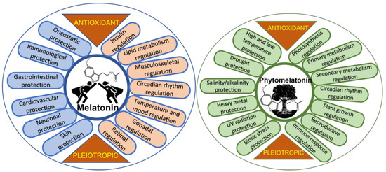 Diagram showing general roles of melatonin in humans and phytomelatonin in plants.