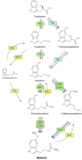 Biosynthetic melatonin pathways in mammals, plants, and microorganisms. The names of the different enzymes are described in the text. The different arrow colors denote plants (green), animals (blue), bacteria (yellow), and yeasts (red). Dashed lines indicate unproven reactions.