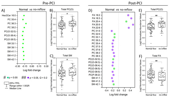 Figure 1 shows the lipids significantly perturbed (p < 0.05) in no-reflow patients compared to normal flow patients at pre-PCI and post-PCI. Twelve lipid species were elevated considerably (p < 0.05) in no-reflow patients compared to normal flow patients at pre-PCI (Figure 1A). They mainly belong to phosphatidylcholine (PC), alkylphosphatidylcholine (PC(O)), and sphingomyelin (SM) classes. In addition, the total amount of two lipid classes, PC(O) and SM, was significantly higher (p < 0.05) in no-reflow patients than in normal flow patients (Figure 1B,C). Consistent with pre-PCI, 17 lipid species belonging to PC, PC(O), and SM lipid classes were also significantly elevated in no-reflow patients at post-PCI (Figure 1D). Surprisingly, fatty acids (FA) exhibited a reverse trend at post-PCI. The levels of five fatty acids (FA 18:2, FA 18:3, FA 20:4, FA 20:5, and FA 22:6), as well as the total fatty acid amount (Figure 1D,F), were significantly lower (p < 0.05) in no-reflow patients than normal flow patients at post-PCI, even after correction for multiple testing (Q < 0.2).