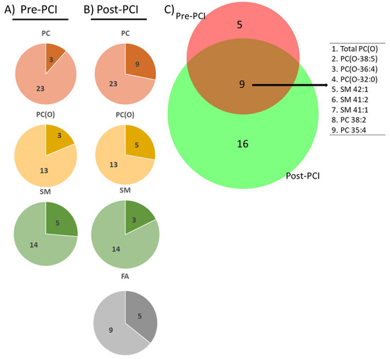 Lipids at pre- and post-PCI. The number of significantly altered lipid species (shown in a darker shade) at (A) pre-PCI and (B) post-PCI as parts of the corresponding whole lipid class. (C) Venn diagram shows the number of significantly altered lipid species (p < 0.05) unique or common between pre-PCI and post-PCI.