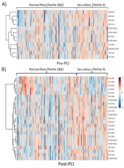 A heatmap of statistically significant lipids (Figure 3) was constructed to visualize the intensity variations between the normal and no-reflow patients at pre-PCI and post-PCI. The heatmap was generated (using default parameters) using the web-based tool MetaboAnalyst (www.metaboanalyst.ca), accessed on 1 October 2021. Except for fatty acids, the levels of all other lipids were generally higher in the no-reflow group than in the normal flow group during both periods (Figure 3A,B). Interestingly, the fatty acid profile was distinct from the rest of the lipids at post-PCI. In the heatmap, related lipids are grouped by hierarchical clustering. Notably, all the fatty acids exhibited a tight clustering post-PCI (Figure 3B), indicating their similarity in action after reperfusion.