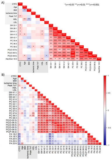 Correlation between lipid species and clinical parameters. The correlation plots depict the strength of the relationship (Pearson correlation) between significantly altered lipid species (p < 0.05) and clinical parameters at (A) pre-PCI and (B) post-PCI. Positive correlations are displayed in red and negative correlations in blue. *, **, *** represents the significant level at p < 0.05, 0.01, 0.001, respectively.