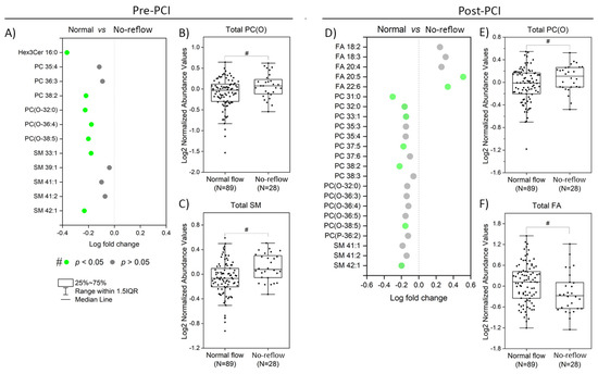 Altered lipid species and classes based on ST segment resolution (A) The significantly altered lipid species between normal and no-reflow subjects (ST resolution < 50%) at pre-PCI. (B,C) Boxplots of the abundance of lipid classes significantly differed between normal and no-reflow subjects (ST resolution < 50%) at pre-PCI. (D) The significantly altered lipid species between normal and no-reflow subjects (ST resolution < 50%) at post-PCI. (E,F) Boxplots of the abundance of lipid classes significantly differed between normal and no-reflow subjects (ST resolution < 50%) at post-PCI. Green circles show lipid species with p < 0.05, and grey circles show lipid species with p > 0.05 after independent Student’s t-test. # represent statistical significance at p < 0.05 after independent Student’s t-test.