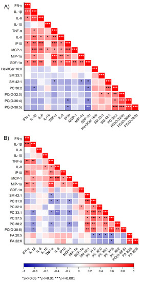 Correlation of cytokines with lipid species. The plot shows the association of significantly altered lipids based on both corrected TIMI frame count (CTFC) and ST-segment resolution with 10 cytokines at pre-PCI (A) and post-PCI (B) for 28 subjects. The red color symbolizes positive correlation, and the blue color symbolizes negative correlation. *, **, *** represents the significant level at p < 0.05, 0.01, 0.001, respectively.