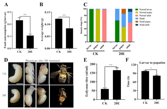 In order to investigate the function of 20E in larval metamorphosis, 2-day-old larvae were fed a diet containing 0.1% 20E until pupation. In the control group, which was fed a diet containing the same volume of solvent, the larvae developed into normal-sized pupae. The 20E-fed larvae showed a lower food intake when compared to solvent-fed larvae (Figure 1A). Compared with the control group, the body weight of the newly emerged worker bees was 35% lower in the 20E-fed larvae (Figure 1B). Furthermore, in the 20E-fed larvae, 35% of the larvae died in the last larval stage, 40% of the larvae died in the pupae stage, and 15% of the larvae developed into small-sized pupae. Only ~9% of the resultant pupae, having been fed on 20E, emerged as normal adults (Figure 1C,D). The remaining treated larvae remained as prepupae or became deformed pupae (Figure 1D). This indicated that treatment with 20E in larvae led to smaller pupae and growth inhibition, possibly due to increased 20E in the hemolymph (Figure 1E), which is consistent with the hemolymph metabolomics data (Figure S1). Additionally, high levels of 20E titer reduced the duration of the worker bee larval feeding period and accelerated larval metamorphosis (Figure 1F).