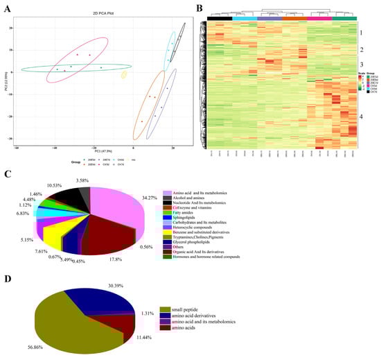 (A) Principal component analysis (PCA) of the different samples. Each point represents one metabolite. There were three biological repeats for each treatment. (B) Hierarchical clustering analysis (HCA) of widely targeted metabolomics of the different samples. Red indicates high abundance; green indicates low abundance. Metabolites were divided into four main clusters. The classification of all the detected metabolites (C) and amino acids (D) of larvae hemolymph samples.