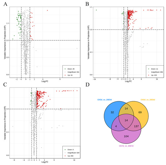 Volcano plot of the differential metabolites of (A) CK-5d vs. 20E-5d; (B) CK-6d vs. 20E-6d; (C) CK-7d vs. 20E-7d. (D) Venn diagram of the differential metabolites of CK-5d vs. 20E-5d, CK-6d vs. 20E-6d and CK-7d vs. 20E-7d. Numbers represent the identified differential metabolites of the pairwise comparisons.