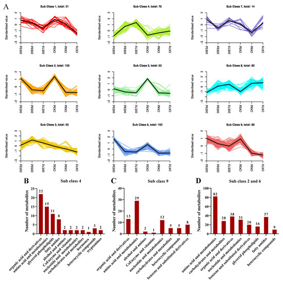 K-means clustering algorithm analysis of the dynamic alteration of the metabolites in three development states of larvae with 20E treatment. (A) K-means cluster was performed on Z-score normalized intensities. Classification of upregulated metabolites in Sub class 4 (B), Sub class 9 (C), Sub class 2 and 6 (D). Three biological replicates were analyzed for each group.