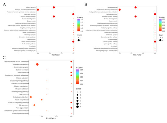 KEGG annotations and enrichment of differentially expressed metabolites of each pairwise comparison of larvae. (A): CK-5d vs. 20E-5d; (B): CK-6d vs. 20E-6d; (C): CK-7d vs. 20E-7d.