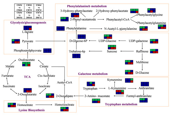 Changes in key metabolites mapped to metabolic pathways in worker bee larvae samples pairwise comparisons. Note: The small red rectangle indicates that metabolite content is significantly upregulated; the small green rectangle indicates that metabolite content is significantly downregulated; the small blue rectangle indicates no significant difference in that metabolite content.