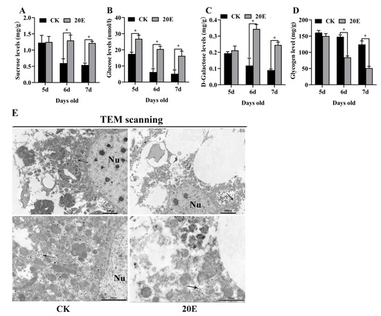 20E increased hemolymph glucose, sucrose and D-Galactose levels during metamorphosis. (A) The hemolymph sucrose levels during development; (B) the hemolymph glucose levels during development; (C) the hemolymph D-Galactose levels during development. Bee Ringer solution was used as the solvent control. (D) Glycogen levels in the fat body. (E) TEM observation after infection with 20E in the fat body. The arrow represented the glycogen particles. Nu: nucleus. The error bars indicate the mean ± SEM of three times repetition. The asterisks indicate significant differences from the control group (*, p < 0.05) by using the Student’s t-test.