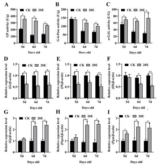 The widely targeted metabolomics showed that 20E increased the hemolymph glucose levels and affected CM during metamorphosis. To further verify the results, we detected the hemolymph glucose, sucrose and galactose levels at 5 d, 6 d and 7 d in larvae. We found that hemolymph glucose, sucrose and galactose levels increased significantly in 20E-fed larvae (Figure 7A–C), which is consistent with the results of the metabolomics. We also measured the glycogen levels in the fat bodies to determine the source of the high glucose levels. We found that the glycogen levels in the fat bodies dropped significantly (Figure 7D). Transmission electron microscopy (TEM) showed a decrease in the number of glycogen molecules in the fat body after the 20E treatment compared with the controls (Figure 7E), indicating that the elevated glucose levels may be caused by degradation and cessation of glycogen synthesis. To investigate this, we examined the activity of key enzymes and the expression levels of genes related to glycometabolism. The activity of the key enzymes responsible for these metabolic steps, GP, G-6-Pase and α-GAL, was higher in the 20E-fed larvae (Figure 8A–C). The mRNA encoding Glycogen synthase (Gs), Pyruvate kinase (Pk) and Hexokinase (Hk), which are key enzymes that catalyze irreversible reactions in the glycolysis pathway, were lower after the 20E treatment (Figure 8D–F). In contrast, the expression level of Pepck, a key enzyme encoding gluconeogenesis, was significantly higher after the 20E treatment (Figure 8H). The transcript levels of the genes encoding glycogen phosphorylase (Gp) and phosphoglucomutase (Pgm), which degrades glycogen, were increased in the worker bee larvae reared with 20E during the prepupa stage (Figure 8G–I), indicating that it promoted glycogen degradation and gluconeogenesis through upregulating the expression of related genes. These data suggested that 20E blocks glycolysis and promotes gluconeogenesis to increase the hemolymph glucose levels in honeybee larvae.