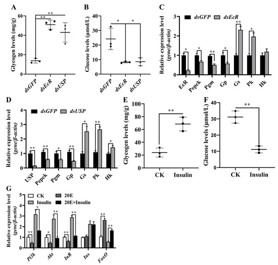 Variation in the levels of metabolites and related gene expression after EcR and USP were knocked down in larvae. (A,B) Glycogen levels in the fat body and glucose levels in the hemolymph after first injection of dsEcR and dsUSP for 48 h. (C,D) Changes in the expression levels of certain genes after EcR and USP knockdown by injection of dsRNA, as detected using qRT-PCR. (E,F) Variation in the levels of metabolites after insulin treatment. (G) Variation in the levels of related gene expression after 20E treatment. The error bars indicate the mean ± SEM of three times repetition. The asterisks indicate significant differences from the control group (*, p < 0.05; **, p < 0.001) by using the Student’s t-test.