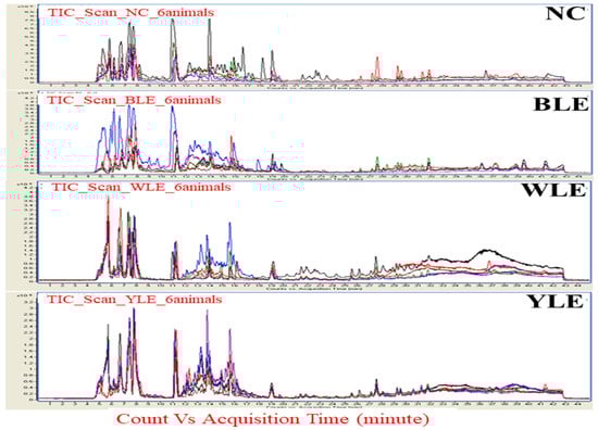 Representation of the spectral features of metabolite peaks obtained in controls (NC), blue light exposure (BLE), white light exposure (WLE), and yellow light exposure (YLE) groups separately. The spectral color of the chromate gram represents each animal from the same group. The X-axis represents the count versus acquisition of the metabolites’ time in minutes, and the Y-axis represents the generated distinct peaks on the total ion chromatogram (TIC) traces (×106).