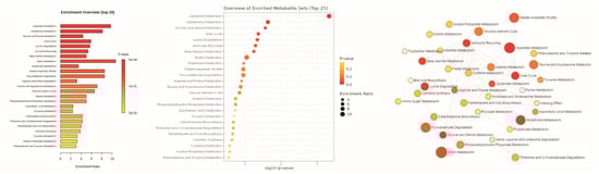 Metabolite set enrichment analysis: The aspartate, glycine, serine, and glutathione metabolic pathways are the most significantly affected in the upper panel; four upregulated FDR = 2.99 × 10−1 and 4/20; FDR = 1.00 in the lower panel; there are four dysregulated features out of 20; false discovery rate (FDR) = 1.00).