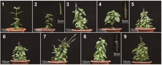 Phenotypes of different Ocimum species. Number 1–9: NO. 1 Ocimum basilicum L.var. pilosum (Willd.) Benth., NO. 2 Ocimum sanctum, NO. 3 Ocimum basilicum cinnamon, NO. 4 Ocimum gratissimum var. suave, NO. 5 Ocimum tashiroi, NO. 6 Ocimum basilicum, NO. 7 Ocimum americanum, NO. 8 Ocimum basilicum ct linalool, and NO. 9 Ocimum basilicum var. basilicum, respectively.