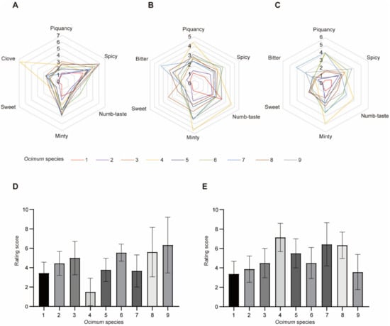Sensory evaluation of different basil species. (A–C): Orthonasal evaluation, retronasal evaluation without heat treatment and retronasal evaluation with heat treatment, respectively. (D,E): Rating score of overall intensity of basils in orthonasal evaluation and retronasal evaluation without heat treatment, respectively. Data are represented as mean ± SD, each included nine replications.