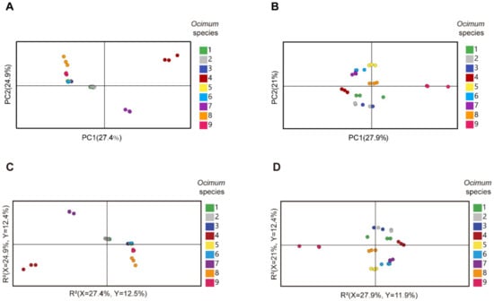 Multivariate analysis of metabolome and volatilome data of different basil species. (A): PCA (principal component analysis) plot of volatilome data. (B): PCA plot of metabolome data. (C): PLS-DA (partial least squares discriminant analysis) plot of volatilome data. (D): PLS-DA plot of metabolome data.