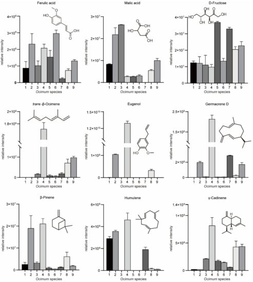 We then subjected the volatilome and metabolome data to principal component analysis (PCA) (Figure 3A,B). The first principal component (PC1) separated the basil species in both plots, and PC1 accounted for 27.4% and 27.9% of the total variance in volatilome and nonvolatile metabolome data, respectively, which indicated significant metabolic differences among basil species. In addition, Ocimum gratissimum var. suave basil (No. 4) was distinctly separated from other species in the PCA plot, which highlighted the consistency between our metabolome and sensory evaluation data. Then, we applied partial least squares discriminant analysis (PLS-DA) and calculated the variable importance in the projection (VIP) value to screen differential metabolites. The results revealed that in the volatilome data, eugenol, β-gurjunene, α-thujene, trans-β-ocimene, germacrene D, α-cadinene, cubenol, cubenene, β-calacorene, α-terpinene, γ-terpinene, α-calacorene, terpinen-4-ol, cadina-1(10),4-diene and cis-2-p-menthen-1-ol have the highest VIP value, while in the metabolome data, glycerol, maltose, D-(+)-xylose, d-galactose, dulcitol, D-ribose, glucose, D-mannitol, D-(−)-erythrose, erythritol, L-(−)-sorbose, malic acid and D-sorbitol have the highest VIP value. These compounds were responsible for the discrimination of basils species (Figure 3C,D). Specifically, eugenol, trans-β-ocimene and germacrene D were among the most varied volatiles within basil species, in which No. 4 had the highest compounds content with a level eight times higher than the average (Figure 4). Given that No. 4 has a strong clove smell, we assumed that these compounds might contribute to the clove smell in basil. In the metabolome analysis, malic acid levels varied greatly among basil species, and No. 3 had the highest level, which was three times higher than the average (Figure 4). Since No. 3 has a characteristic sweet taste, we hypothesized that malic acid might contribute to the sweet taste of basil [25,26]. Our results showed that terpenes, sugars and organic acids are significantly varied among basil species. To confirm their contributory role in basil aroma and flavor, we combined the metabolomics/volatilomics data and sensory evaluation results and carried out correlation analysis.