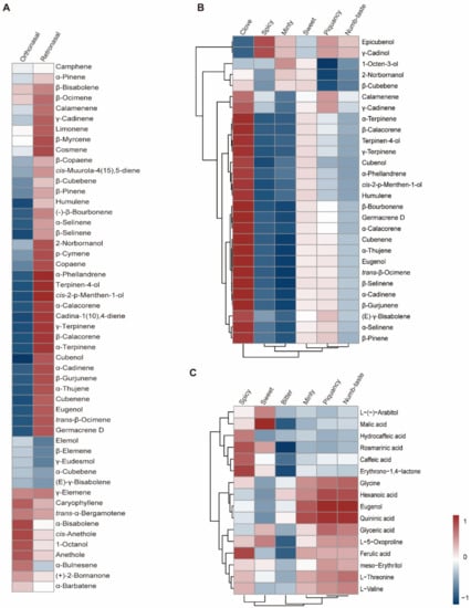 Correlation analysis between sensory evaluation results and metabolome/volatilome data. (A): Correlation analysis between overall intensity in orthonasal/retronasal evaluation and volatilome data. (B): Correlation analysis between different attributes rating in orthonasal evaluation and volatilome data. (C): Correlation analysis between different attributes rating in retronasal evaluation and metabolome data. Red and blue indicates positive and negative correlation, respectively.