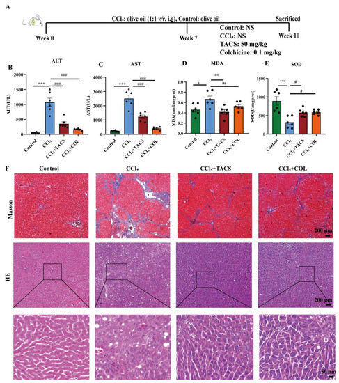 Figure 1. Effects of TACS on liver fibrosis in CCl4-induced rats. (A) Animal experiment design (B,C) The serum of ALT and AST levels (n = 6). (D,E) The liver of MDA and SOD levels (n = 6). (F) Representative Masson and H&E staining of liver tissue photos. Data were expressed as the mean ± SEM. * p < 0.05, *** p < 0.001 vs. control group; # p < 0.05, ## p < 0.01, ### p < 0.001 vs. CCl4-treated group, ns represents no significance.
