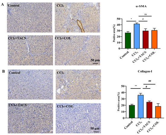 Figure 2. TACS inhibited α-SMA and collagen-I expression in CCl4-induced rats. (A) α-SMA immunohistochemistry representative photos and the positive area of α-SMA expression (n = 3). (B) Collagen-Ι immunohistochemistry representative images and the positive area of collagen-Ι expression (n = 3). Data were expressed as the mean ± SEM. * p < 0.05, ** p < 0.01 vs. control group; # p < 0.05, ## p < 0.01 vs. CCl4-treated group, ns represents no significance.