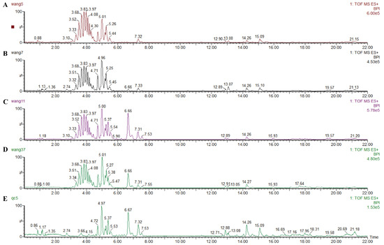 Figure 3. Typical BPI of feces samples in positive ESI mode. (A) Control group; (B) CCl4-induced liver fibrosis group; (C) CCl4 + TACS group; (D) CCl4+ COL group; (E) QC (quality control).