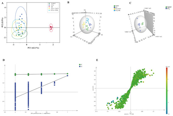 Figure 4. TACS intervention on CCl4−induced liver fibrosis rats. (A) PCA score plot; (B) PLS−DA score plot; (C) OPLS−DA analysis of the control and CCl4 groups; (D) Permutation test (n = 200 times) was used to validate the OPLS−DA model. (E) S−plot in control group and CCl4−induced liver fibrosis group detected in positive ion mode.
