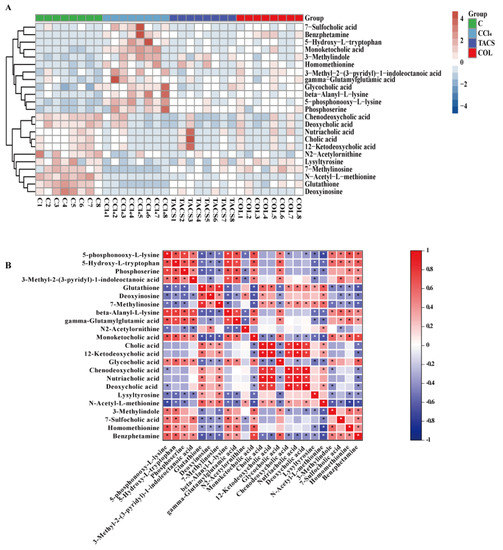 Figure 5. Identification of potential biomarkers for liver fibrosis. (A) Heatmap of the differential metabolites of liver fibrosis affected by TACS and COL. Blue: down−regulated; red: up−regulated (n = 8). (B) Spearman correlations between the differential metabolites. Red: significant positive correlations, blue: significant negative correlations. * p < 0.05.