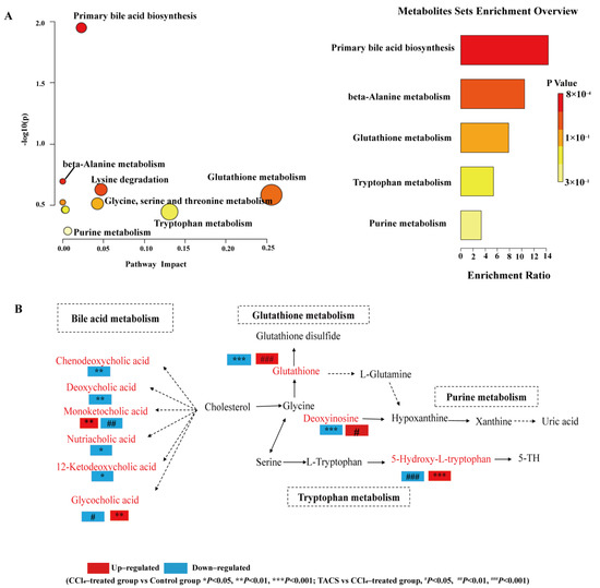 Bile acids are key end products of cholesterol metabolism. Primary bile acids are synthesized in the liver, secreted by hepatocytes, and converted into secondary bile acids by intestinal flora, promoting intestinal nutrient absorption and maintaining bile acid homeostasis (Figure 6B). Bile acids mainly reside in the enterohepatic circulatory system and regulate lipid metabolism and microbiota composition by recycling [30,31]. Several studies have shown that bile acid metabolism is disturbed with liver fibrosis [32] and that this disruption leads to intestinal microbiota dysregulation that destroys the intestinal barrier function, causing intestinal inflammation [33,34]. We hypothesized that this result was due to the intestinal microbiota disorder caused by liver fibrosis that may destroy the intestinal barrier function. The destruction of the intestinal barrier leads to various metabolites in the intestinal lumen such as bile acids, lipopolysaccharide (LPS), etc., into the body, thereby aggravating liver fibrosis [35]. A clinical study showed that nutriacholic acid was significantly decreased in patients with hepatocellular carcinoma and can be regarded as one of the independent risk factors for hepatocellular tumor recurrence [36]. In our study, the level of nutriacholic acid was decreased in the CCl4-treated group; this change is consistent with other reports. Glycholic acid (GCA) is a main diagnostic indicator of liver disease [37]. Kang et al. found that the level of GCA in patients with liver fibrosis was significantly increased and had the strongest correlation with fibrosis [38]. GCA is an endogenous ligand of FXR in the gut. Xu et al. found that L-Theanine can increase the level of intestinal GCA by regulating intestinal bacterial activity associated with bile–salt hydrolase (BSH), which can inhibit the ileal FXR-FGF15 and regulate the classical BA metabolic pathway, thus maintaining the homeostasis of intestinal and hepatic circulation [39]. In this study, the level of GCA was significantly increased in the CCl4-treated group. After TACS treatment, the level of GCA was restored. Previous research has also shown that TACS could regulate the disturbance of bile acid metabolism caused by antibiotics [19]. Therefore, we hypothesized that TACS may exert an anti-fibrosis effect by regulating bile acid synthesis and metabolism.