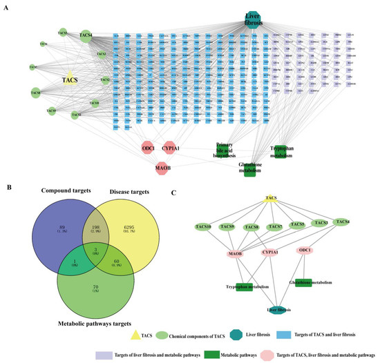 First, the Swiss Target Prediction database (http://www.swisstargetprediction.ch/) (accessed on 5 September 2022) and Batman-TCM were applied to search for TACS-related targets. Secondly, liver fibrosis-related targets were searched from Gene Cards (https://www.genecards.org/) (accessed on 5 September 2022), OMIM (https://omim.org/) (accessed on 5 September 2022) databases and TTD (http://db.idrblab.net/ttd/) (accessed on 5 September 2022). Cytoscape3.7.2. was applied to construct the “compound-target” network map and protein interaction (PPI) map.