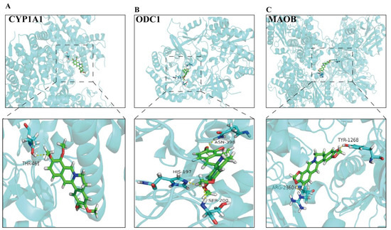 Molecular docking was applied to deeply explore the possibility of interaction between TACS (dehydrocavidine, tetrahydropalmatine and palmatine) and potential key targets. Our findings show that MAOB and dehydrocavidine, ODC1 and tetrahydropalmatine, CYP1A1 and palmatine have a strong affinity (Figure 8). The smaller the value of the docking score of the compound and the target, the worse the binding activity will be [21]. The number of conformations docked for each compound with free binding energy lower than −17 kcal/mol were shown in Table S9.