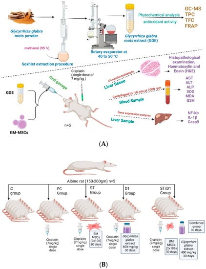 Furthermore, the accumulation of the intracellular ROS induces proinflammatory cytokines via the nuclear factor kappa-light-chain-enhancer of activated B cells (NF-kB) and the pro-apoptotic pathways by means of caspase 9 (Casp9) [10]. Additionally, many studies reported that cisplatin itself induced the overexpression of proinflammatory cytokines such as interleukin-1β (IL-1β) [11,12]. Consequently, cisplatin-induced serious histopathological alterations in the liver, including multifocal hepatocellular necrosis and mononuclear inflammatory cell infiltration. In addition, it increased mitotic activity in the liver, leading to dysplastic changes. Many studies have focused on relieving cisplatin-induced liver toxicity because cisplatin has therapeutic value as an anticancer drug [13,14]. Nature provides many herbal plants with beneficial therapeutic effects. One of the widely used herbal medicines is Licorice, that is extracted from the roots of the Glycyrrhiza species (Leguminosae family) [15]. In folk medicine, Glycyrrhiza glabra extract (GGE) has been an agent of choice in treating liver injury for many years [16].