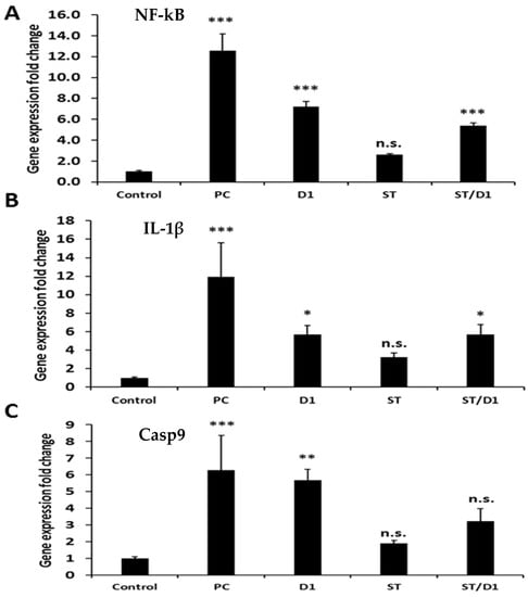 The effect of treated groups (Control, Cisplatin (P.C.), Cisplatin + GGE (D1), Cisplatin + BM-MSCs (St), Cisplatin + BM-MSCs + GGE (St/D1)) on gene expression profiling of the liver in rats. (A) NF-kB, (B) IL-1β, and (C) Casp9. *** highly significant p < 0.001, ** significant p < 0.005, * significant p < 0.05 and n.s mean non-significant.