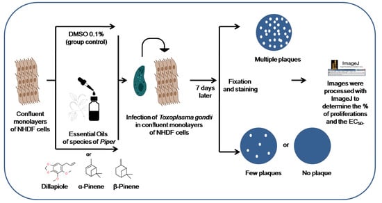 NHDF cells were maintained in 6-well culture plates at 37 °C and 5% CO2. After verifying the formation of NHDF monolayers, the old medium was removed and a new complete RPMI-1640 medium was added, adding either EOs of Piper or the major compounds once, at final concentrations of 0.5, 1, 2.5, 5, 10, 15, 20 μg/mL. Subsequently, previously counted tachyzoites of the RH strain were added to achieve an amount of 800 tachyzoites/well. The plates were left for 7 days at 37 °C and 5% CO2. After verifying the infection of NHDF monolayers by T. gondii tachyzoites, the culture medium was discarded, and the plates were fixed with 99% ethanol and stained with crystal violet to visualize plaque formation. The plates were then photographed on an Alpha DigiDocphoto document. Images were processed with ImageJ software to determine plaque area. The areas of each well of the plate treated with EOs of Piper or major compounds were compared with the control treated only with 0.1% DMSO and the percentages of proliferations were calculated to obtain the respective 50% effective concentrations (EC50) (Figure 1).