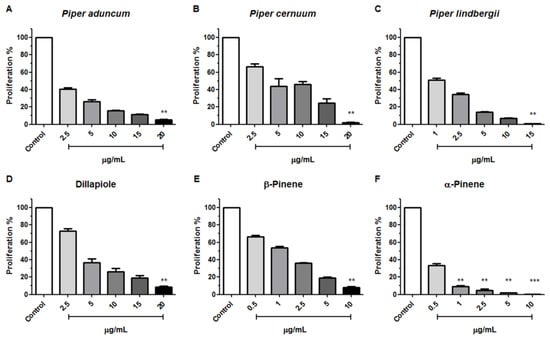 Antiproliferative effects of essential oils from three Piper species (A–C) and dillapiole, β-Pinene and α-Pinene (D–F) on tachyzoites of the T. gondii RH strain 7 days after treatment. Kruskal–Wallisfollowed by Dunn’s posthoc test was performed (** p < 0.001, and *** p < 0.0001 among the compared groups).